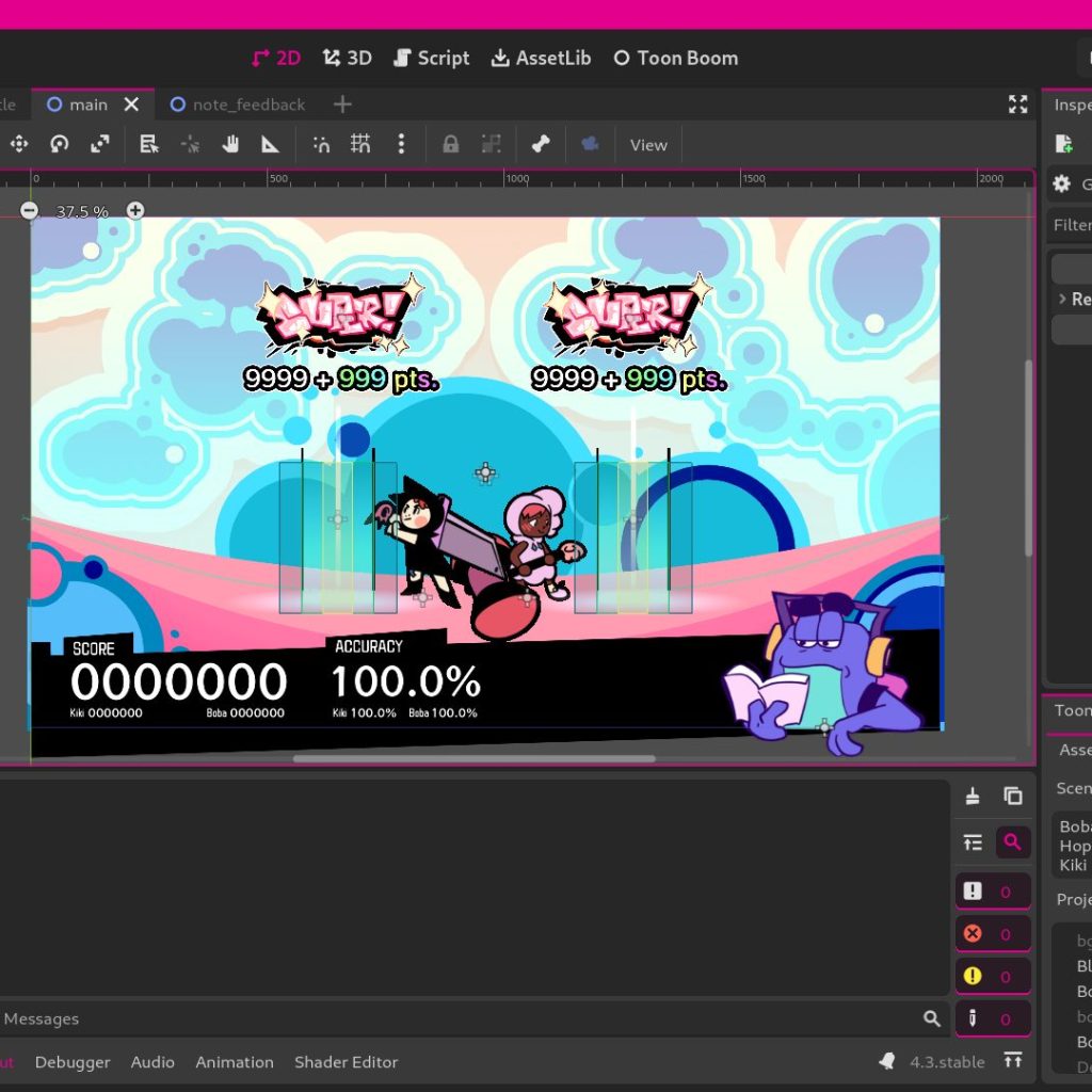 Entonces, si mis compañeros de equipo hacían trabajos de animación en, por ejemplo, Kiki o Boba, podía descargar fácilmente el nuevo archivo, colocarlo en la carpeta del juego y luego exportarlo en la resolución correcta. A partir de ahí, Jump! crearía automáticamente un archivo de escena de Godot Engine que configuraría los datos de animación de los personajes exactamente como los definimos en el editor de activos, lo cual fue increíblemente útil, ¡fácilmente mi característica favorita!